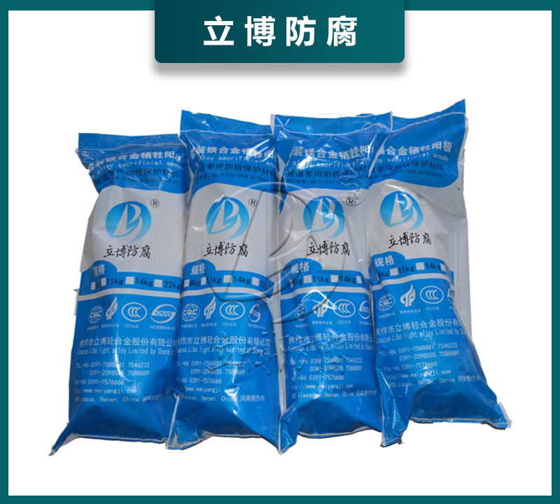 · 成套鎂犧牲陽極,由鎂犧牲陽極錠1支,一根VV-10㎜2電纜3米,填包料50kg,棉布口袋1條,塑料編織袋1條組成。即棉布口袋內(nèi)有鎂犧牲陽極錠1支其鐵芯上焊VV-10㎜2電纜3米1根,焊接處做絕緣處理,并套有熱縮管。鎂犧牲陽極錠周圍均勻分布50kg填包料。棉布口袋外套塑料編織袋1條。